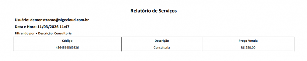 Relatório (ícone): nesta opção, será possível gerar um relatório dos serviços cadastrados em PDF ou Excel;