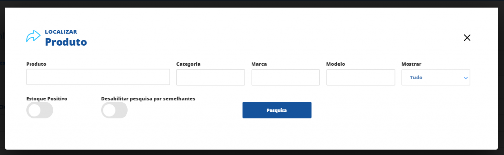 Ícone de Lupa: se houver necessidade de uma pesquisa mais específica, clique no ícone e poderá pesquisar seu produto por: Nome, Código, Categoria, Marca, Modelo, opção Estoque Positivo (marque se deseja que apareçam apenas produtos com saldo positivo) e opção Desabilitar pesquisa por semelhantes (marque se deseja que o sistema não faça a busca por produtos semelhantes).