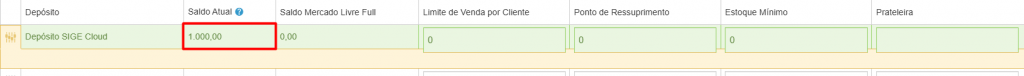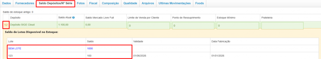 Em nosso exemplo, é possível confirmar que não há mais saldo em estoque controlado por Lote do produto “Calça Jeans” no Depósito SIGE Cloud.