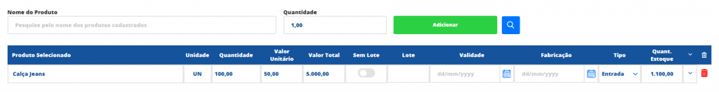 Ao selecionar o produto e informar quantidade, clique em Adicionar. Ao clicar, o sistema irá exibir o produto em uma listagem com novos campos.