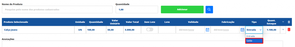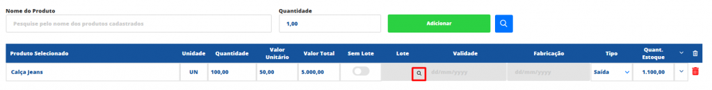 Nome do Produto: localize o produto que deseja realizar a movimentação, pesquisando-o pelo nome ou código;