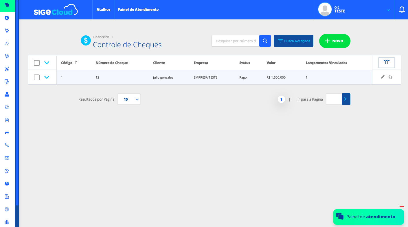 - No menu lateral, clique em Financeiro > Controle de Cheque.