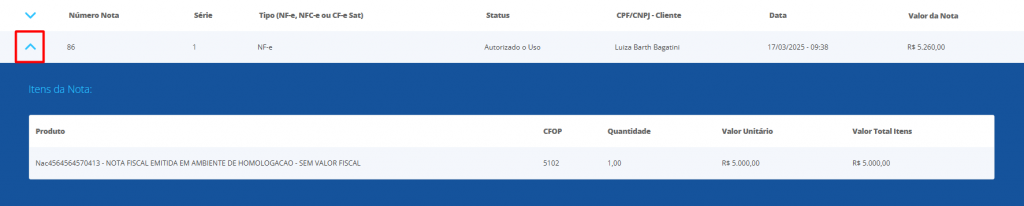 Ao Expandir cada linha do relatório, trará as informações competentes aquela nota: