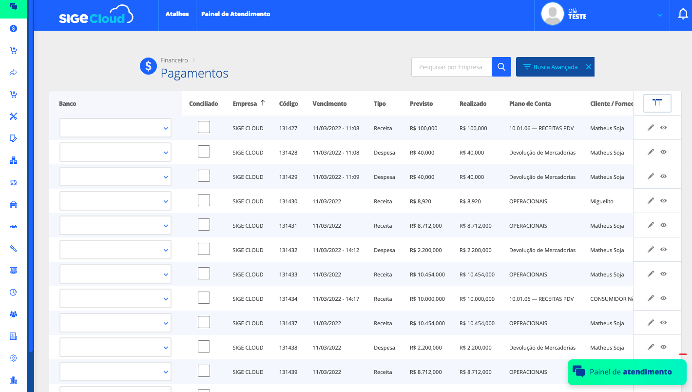 Nessa tela, ficam disponíveis informações como banco, data de vencimento, valor previsto, valor realizado, plano de conta, cliente/fornecedor e situação de conciliação.