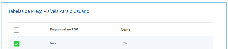 Ao acessar, busque pelo usuário desejado e direcione-se até a seção Restrições de Acesso. Na seção, deslize a tela até a aba Tabelas de Preço Visíveis Para o Usuário, onde será possível permitir tabela por tabela, habilitando o checkbox correspondente a cada uma.