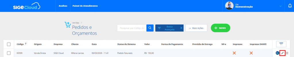 Após isto, busque e edite a venda que deseja cancelar e em seguida, clique em Mais Ações.